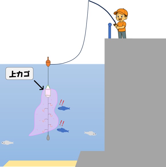 上カゴは広範囲に魚を寄せたいときや、表層〜中層に魚がいるときに効果的。